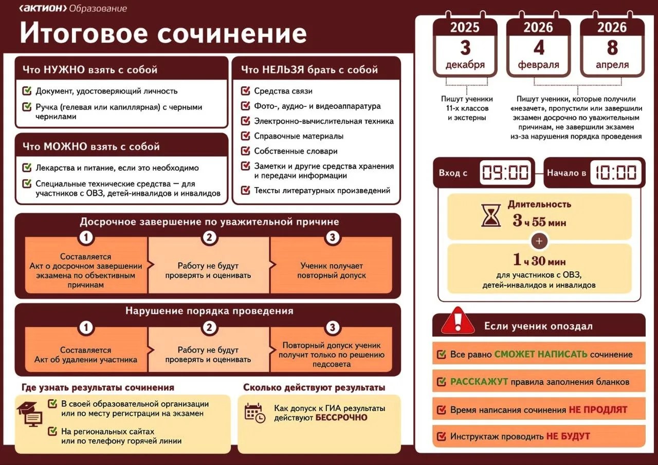 Итоговое сочинение (изложение) начинается в 10.00 по местному времени. Продолжительность написания итогового сочинения (изложения) составляет 3 часа 55 минут.