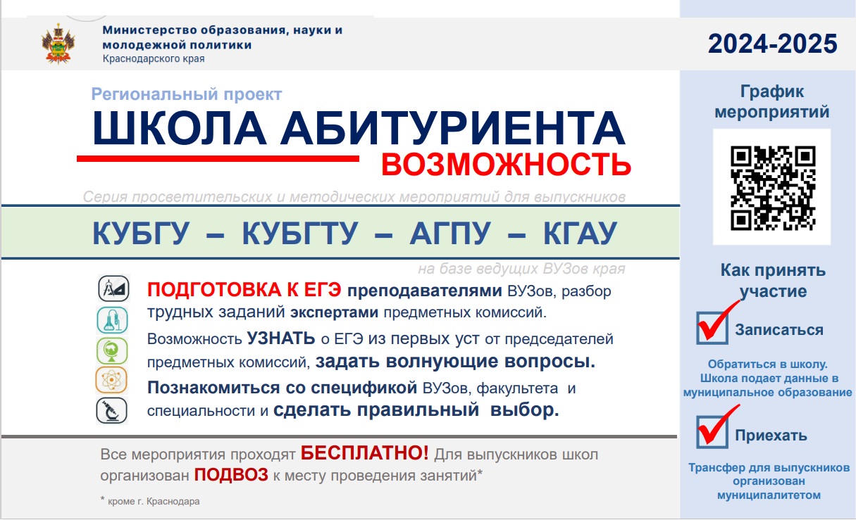 В Краснодарском крае реализуется региональный проект «Школа абитуриента» в 2024-2025 учебном году.