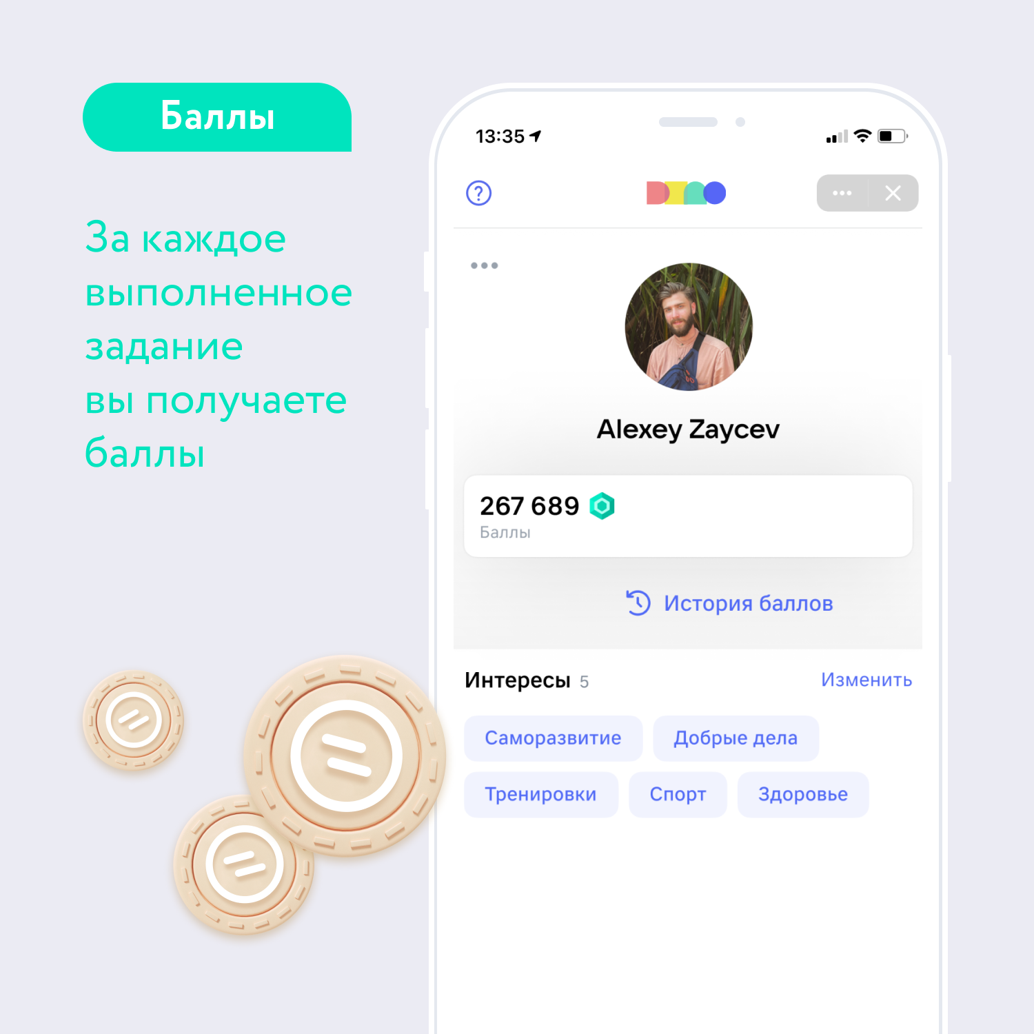Задания направлены на всестороннее развитие, социальную активность и здоровые привычки: баллы можно заработать на занятиях спортом, чтении книг, посещении выставок, прогулках с собаками и многих других видах активностей. Есть задания и для детей, поэтому можете смело привлекать их к полезным задачам, мотивируя бонусами!